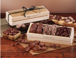 This handmade, sustainable wooden crate (Made in USA) is firebranded with your logo and hand-tied with black raffia for an elegant touch. Inside you’ll find three of our most popular treats, available in the assortment of your choice. No matter which you choose, your recipients will enjoy the finest gourmet chocolate and nuts!